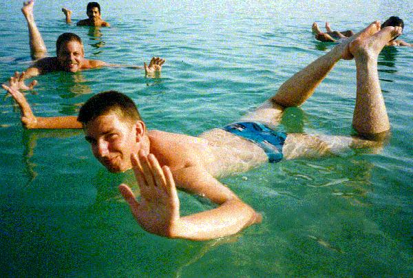Floating in the Dead Sea.Carlo van Uden (middle) and Fred Rambi (back)